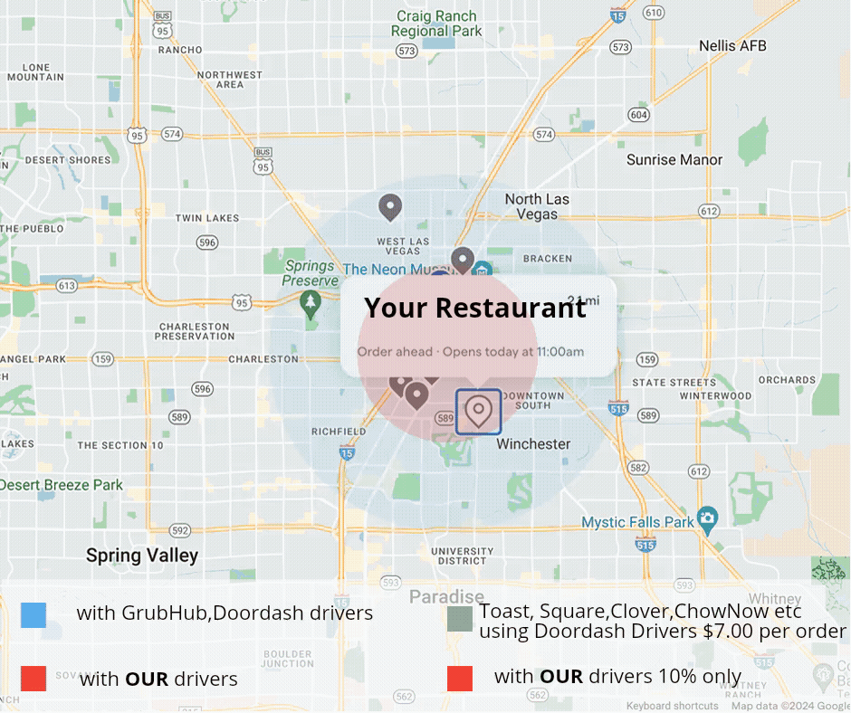 Most apps are charging restaurants 30-40% in commissions—not with"Your Business Name Here". By partnering with us, restaurants continue receiving their orders from the platforms: GrubHub, Doordash etc. same way but those Restaurants will be using our drivers instead of the platforms's drivers.